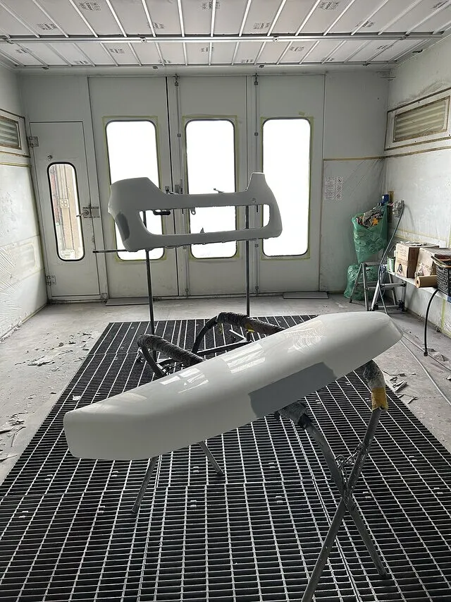塗装後は数時間時間を置き、電気でしっかり焼き付けします。焼き付けが終わったらボンネットとバンパーを組みつけます。組みつけ後は塗装した部品をすべて綺麗に磨き、最後はお客様に修理箇所の確認をしていただきます。