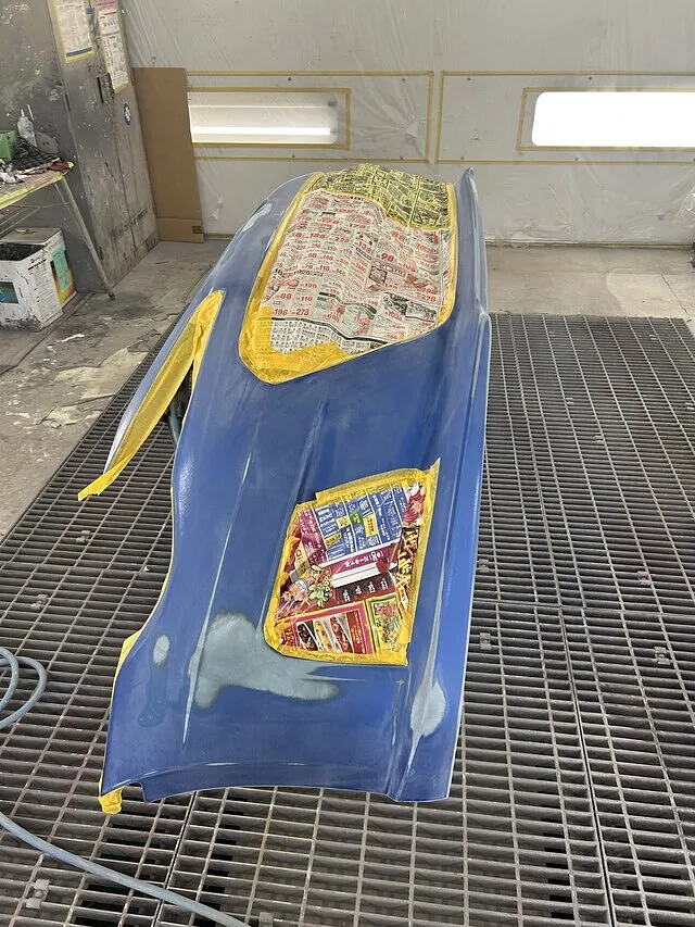 次に板金修理。損傷個所や飛び石等のキズを削るため、機械とパテを使い綺麗に修理しました。最後はサフェーサーで仕上げます。