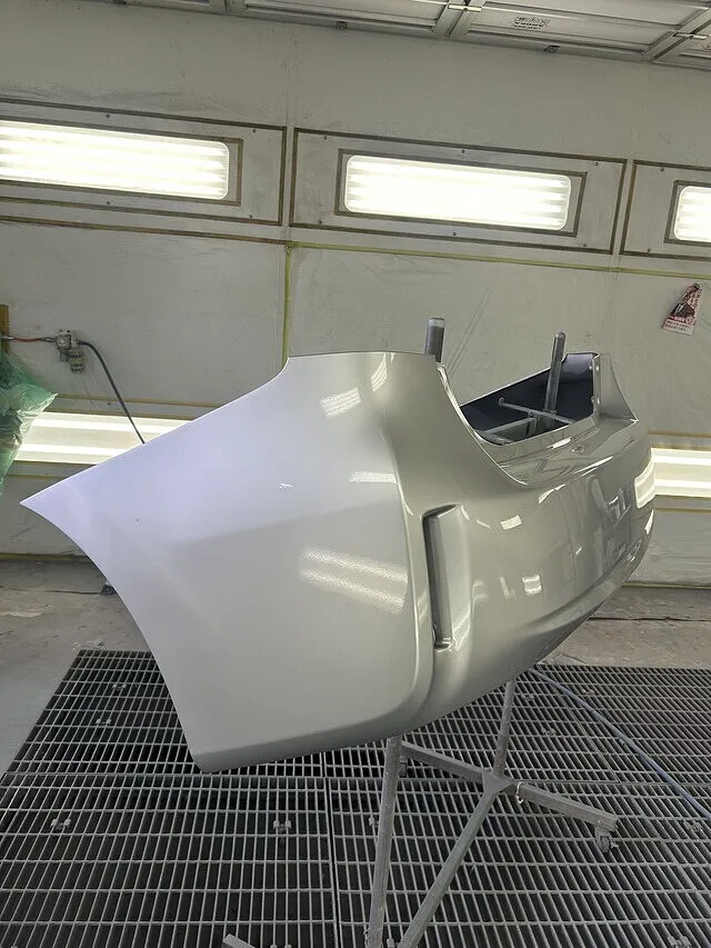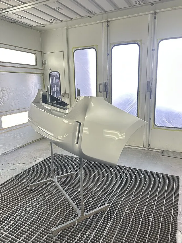 塗装後は時間置きます。(3時間ぐらい)塗装がある程度乾いたら電気にあて、焼付作業を行います。先に焼き付けし、バンパーの付属品を取り付け、車体に組付けます。組付けたらリアバンパーをきれいに磨きます。