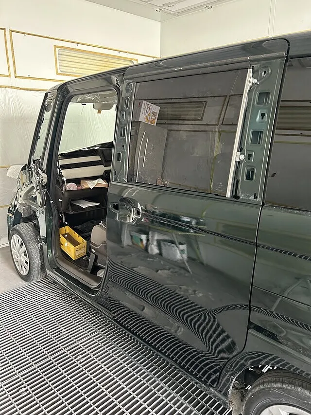 最後はNBOXを塗装ブースに運び、塗装したい箇所以外を新聞で隠し、フロントドアを中心にフロントフェンダーと左スライドドアをぼかして塗装します。