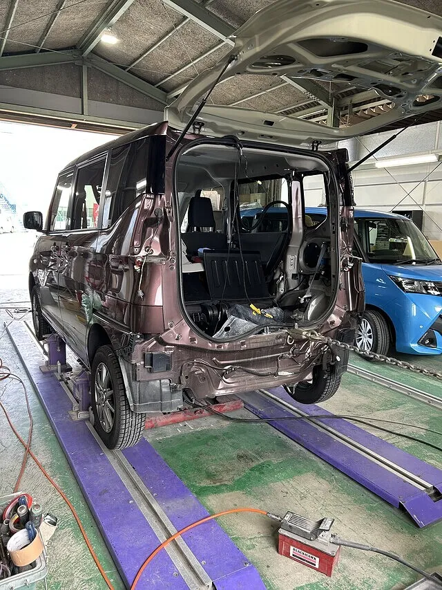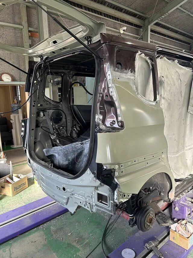 今回交換する大まかな部品はバックドアとリアバンパー、右テールランプ、マフラー、バックパネル、右クォーターパネルです。まずは部品のばらしをします。リアバンパーをはずし、左右テールランプも外します。次にバックドアを分解し外します。内装トリムも一部晴らし、最後は右スライドドアの付属品を外した後、ドアも外します。