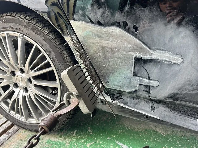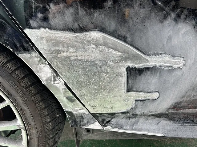 ここから板金修理です。損傷個所は右リアドアと右クォーターパネルです。まずは右リアドアのへこみ傷をアラダシします。大体形になればとりあえずはオッケーです。次にクォーターパネル。こちらはピンを溶かし、引っ張るアラダシ作業が必要です。写真はアラダシ作業中の写真です。