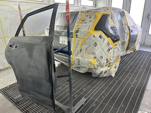 今回の修理希望個所はフロントバンパーと右リアドアです。フロントバンパーは少し前にぶつけたそうで、今回リアドアをひどくぶつけたため、ついでにフロントバンパーも修理したいとのことでした。お見積もりを作り、ご入庫いただきました。
