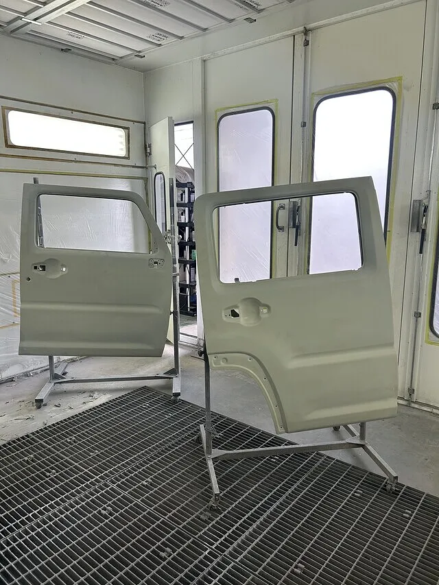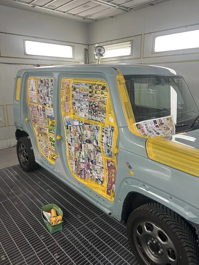 色ができたら塗装。車体側の塗装と新品フロントドア、リアドアをきれいに塗装します。右フロントフェンダーはぼかして塗装します。