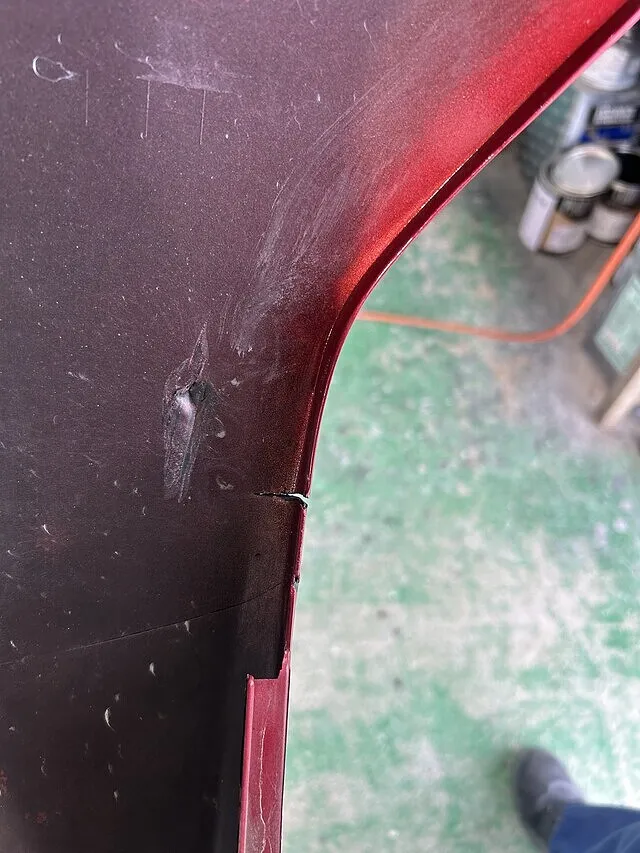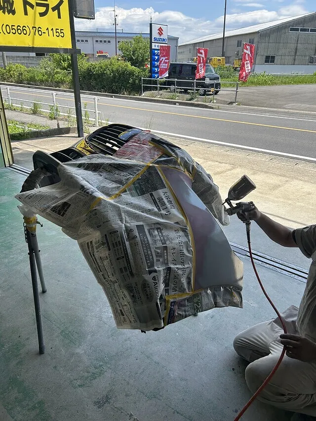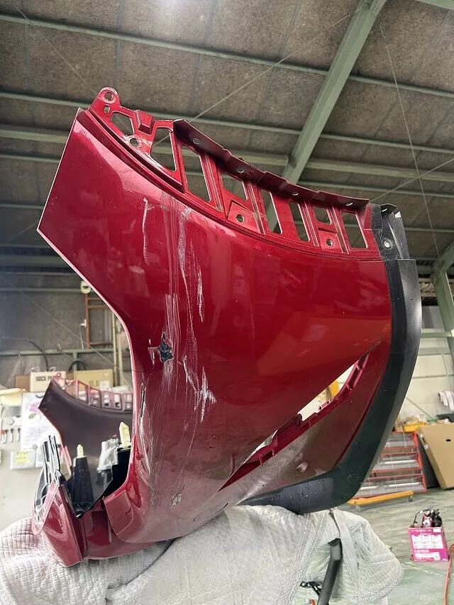 フロントバンパーを外し、バンパーの付属品を脱着。脱着後、バンパーの割れ部分を接着し、外面のガリ傷を機械で削ります。ある程度削ったらパテで形にして、ペーパーで形を整えます。形を整えたらサフェーサーで仕上げます。