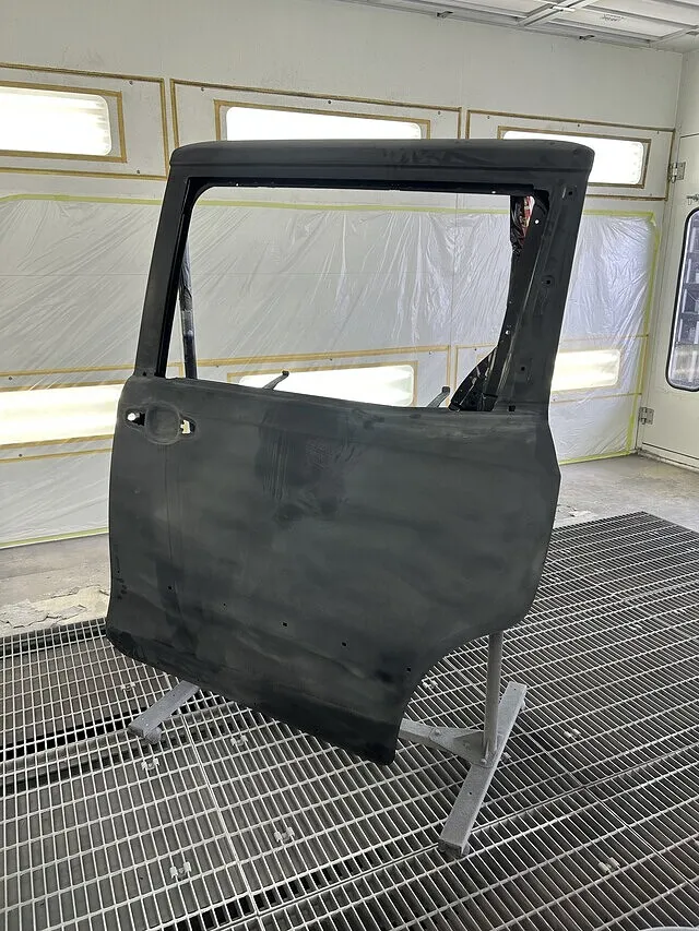 今回の修理はスライドドア交換です。まずはスライドドアを取り外します。取り外したら新品スライドドアを足付けし、シーラーをうちます。次に色合わせ。車体の色番を確認し、配合を調べます。配合を調べたら調色。色ができたら試しぶきシートに塗装し、色具合を確認します。今回は黒のソリットなので一発で色が合いました。色ができたらスライドドアを塗装します。