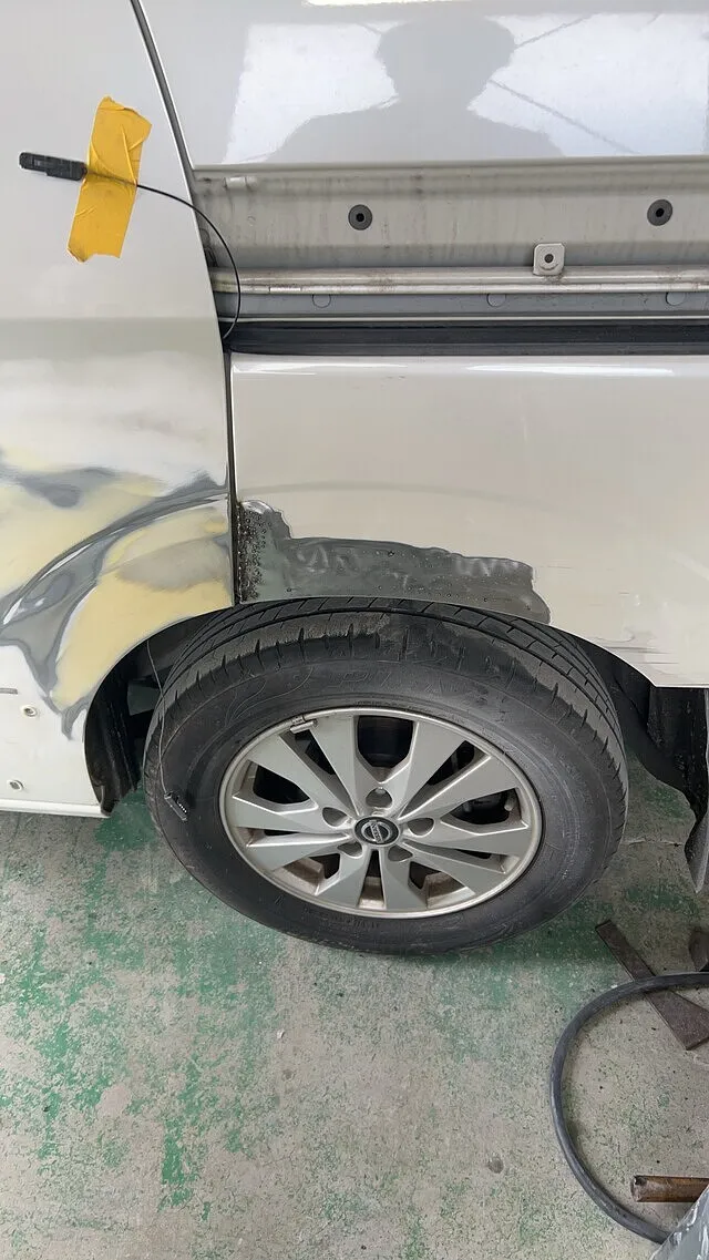 スライドドア修理後はクォーターパネルの修理。この順番には訳が合って、先にスライドドアを修理することでクォーターパネルの高さを測ることができます。なので先にクォーターパネルのミミを板金し、その高さに合わせながら板金修理します。