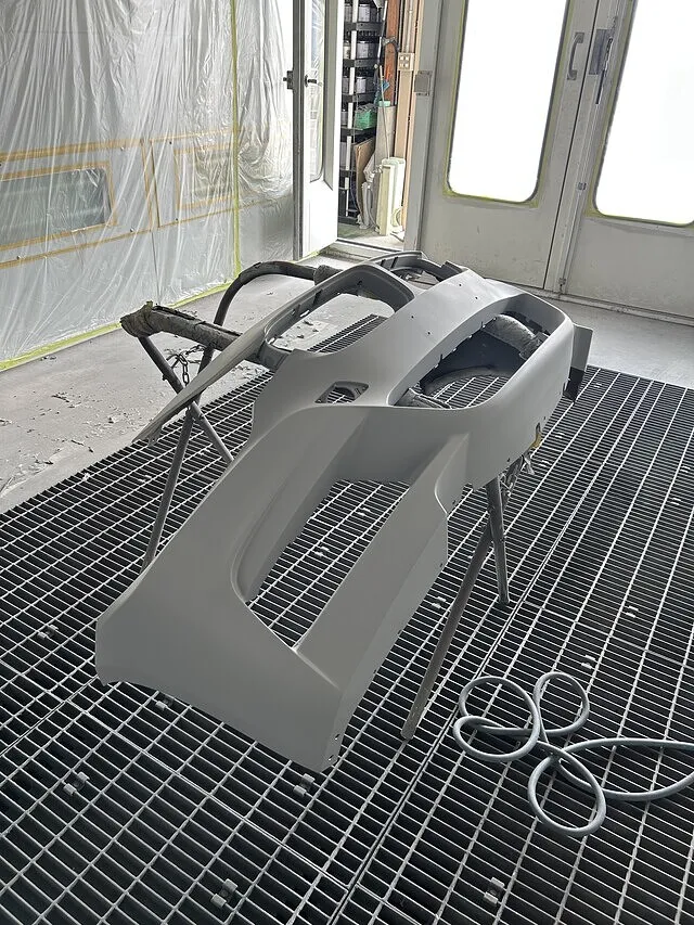 次に新品フロントバンパーを足付けし、サフェーサーを一本ふきました。
