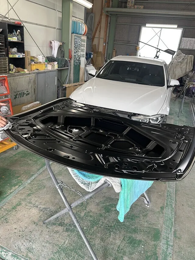 焼き付けが完了したら部品の組付け。ボンネットを組み付け、フロントバンパー組み換え。組み換え後は車体にフロントバンパーを組み付けます。組付けたら塗装した部品の磨きを行い、お客様に仕上がり確認をしていただきます。