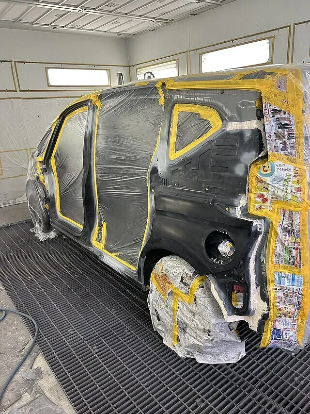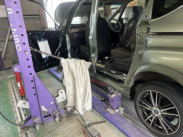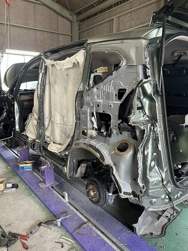 まずは部品ばらしです。交換する左フェンダー、左フロントドア、左スライドドアを外しました。他にもフロントバンパーとリアバンパー、左テールランプ、左ヘッドライトを外します。ばらしが完了したらあらだし。写真のようにセンターピラーのあら出しをします。