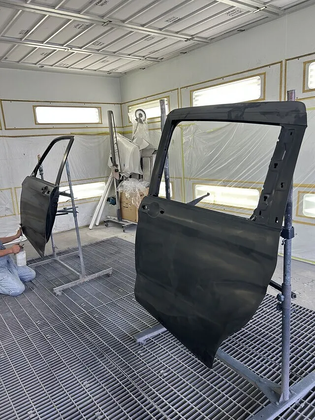 ドアの仮塗装をしたら今度は車体側の仮塗装。塗装後は電気で焼き付けします。(ドアも焼き付けしました。)