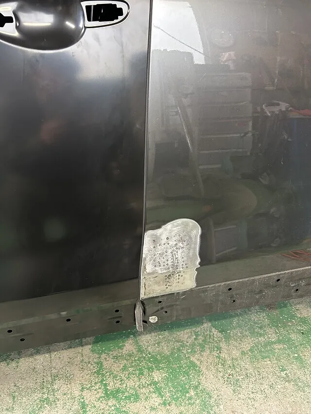 次に板金修理。フロントドアの新品を仮付けし、リアドアを板金します。