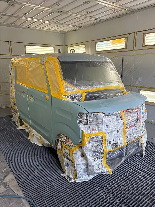 こちらが塗装準備後の写真です。この後ボンネットと右フェンダー、右フロントドアを中心にリアドアまでぼかして塗装します。