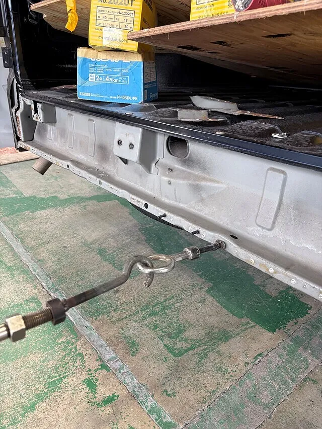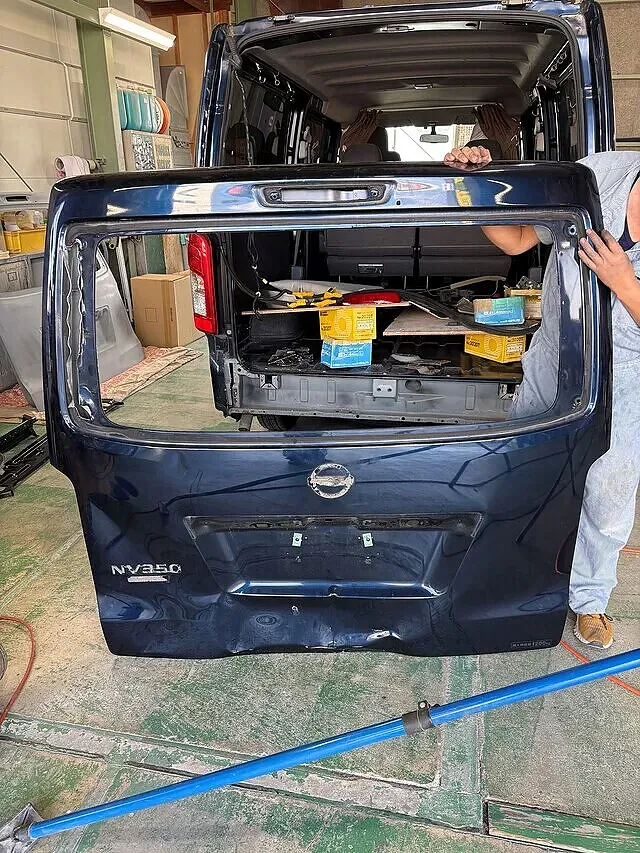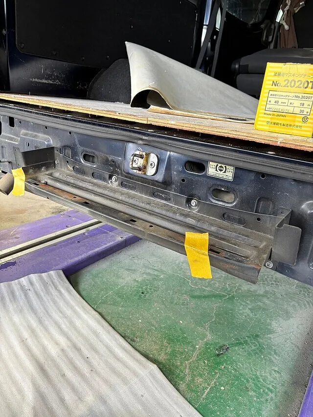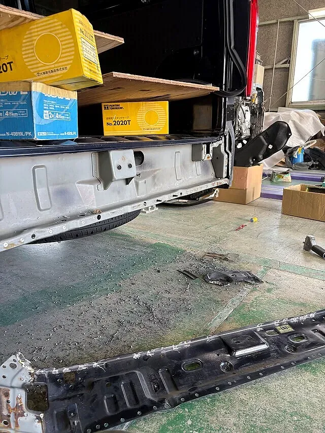 まずは交換するリアバンパーとバックドアを外します。次にバックパネル付属品を外します。外したらバックパネルのあら出しをします。