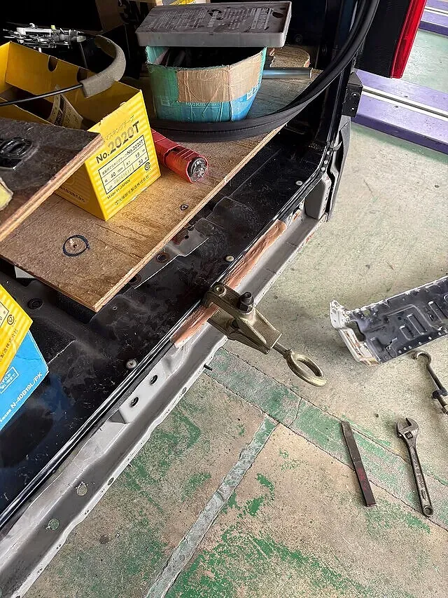 修正作業が終わったら新品パネル取付。スポットと溶接を使いパネルを取り付けます。