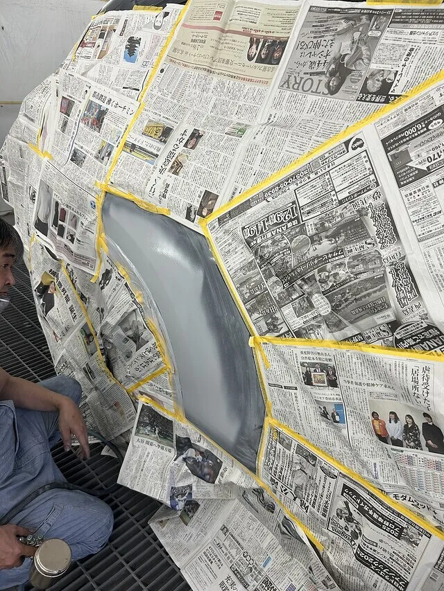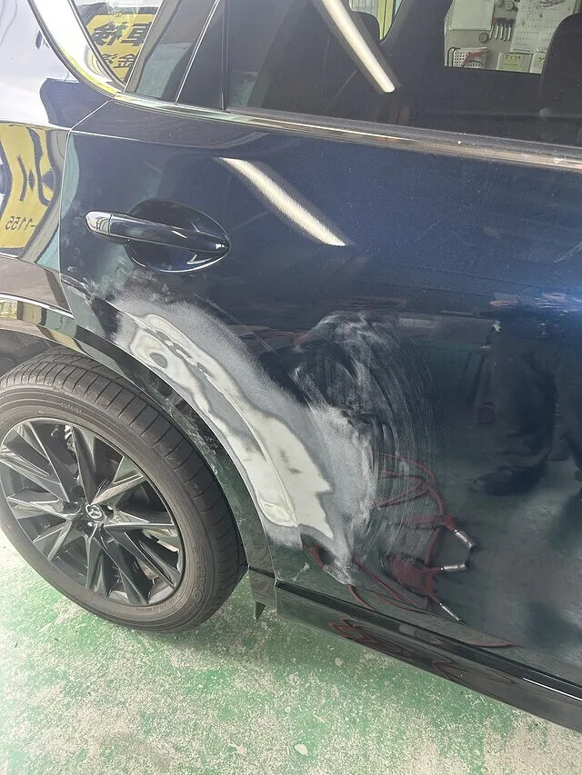 右リアドア修理では損傷個所の塗装をはがし、へこみをあら出しします。へこみのあら出しが終わったら、パテで形を作ります。その後電気でパテを乾燥させ、ペーパーで形を整えます。綺麗に削れたらサフェーサーで仕上げます。
