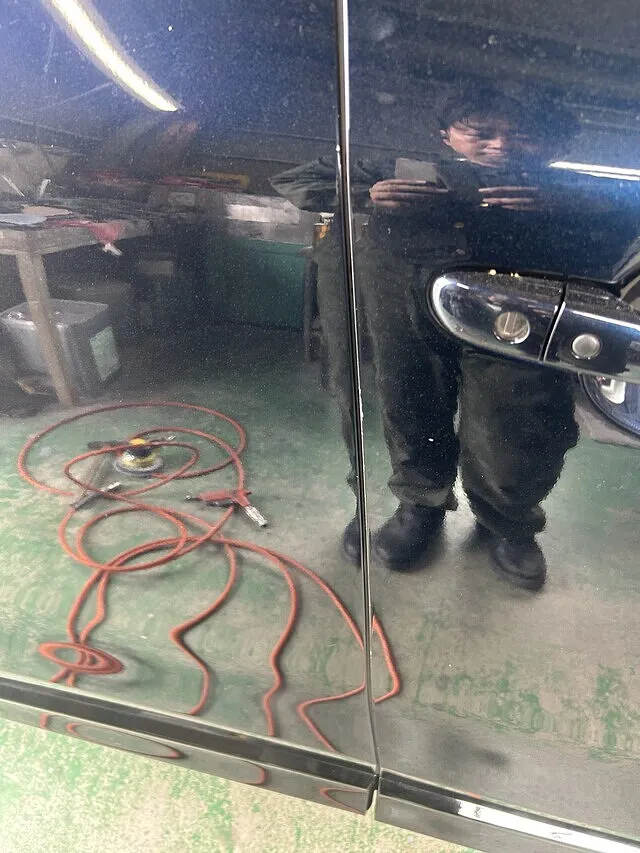 こちらが今回修理したお車です。リアドアはひずみもなく、綺麗に直りました。フロントドアも綺麗に色がぼけてました。お客様にも修理箇所を確認していただきました。